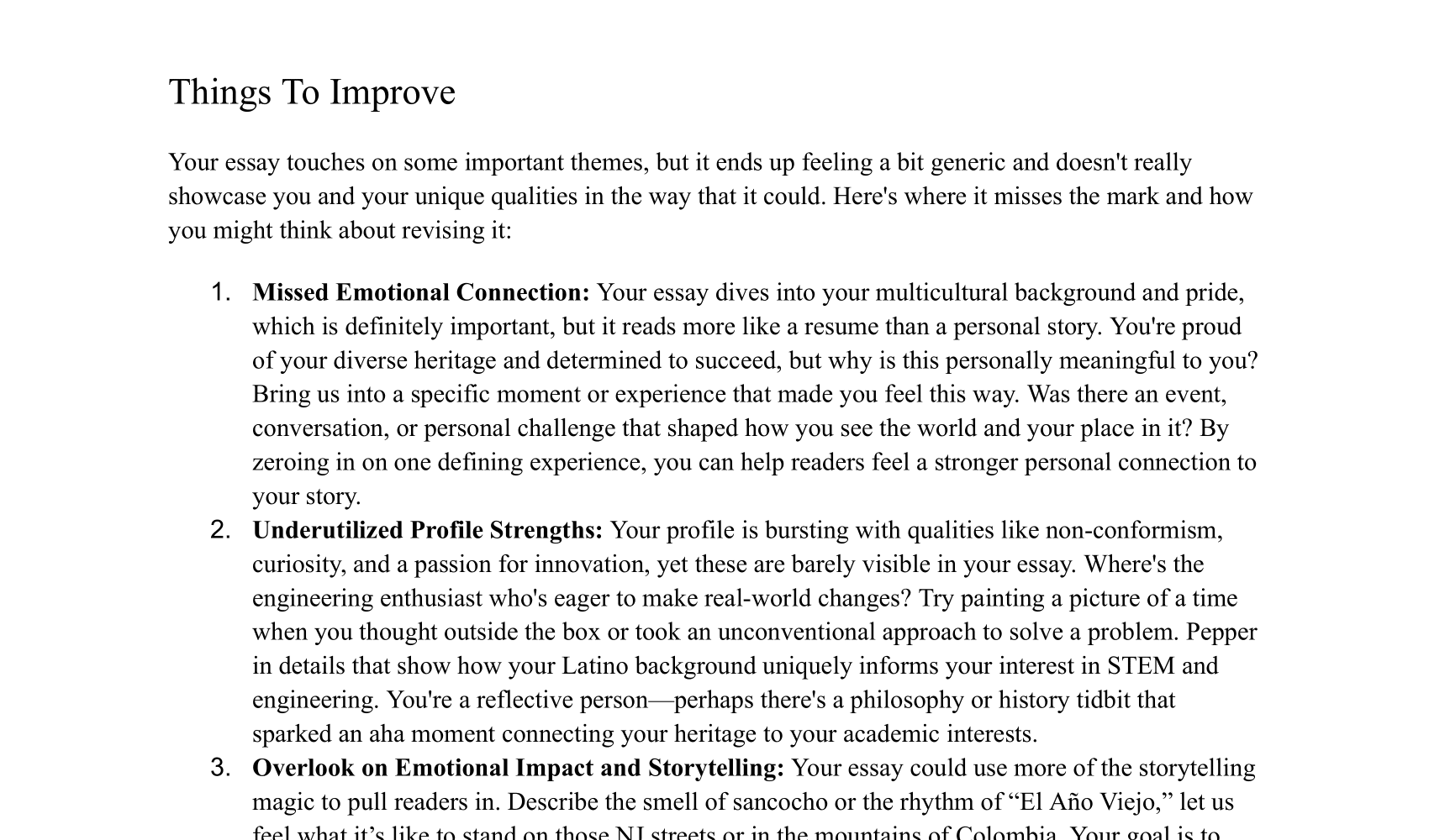 Having gone through the college applications process ourselves, we were frustrated seeing how many students weren't representing themselves well in their essays, and decided to build a solution, combining top essay writing practices with AI to make high-quality essay feedback affordable.