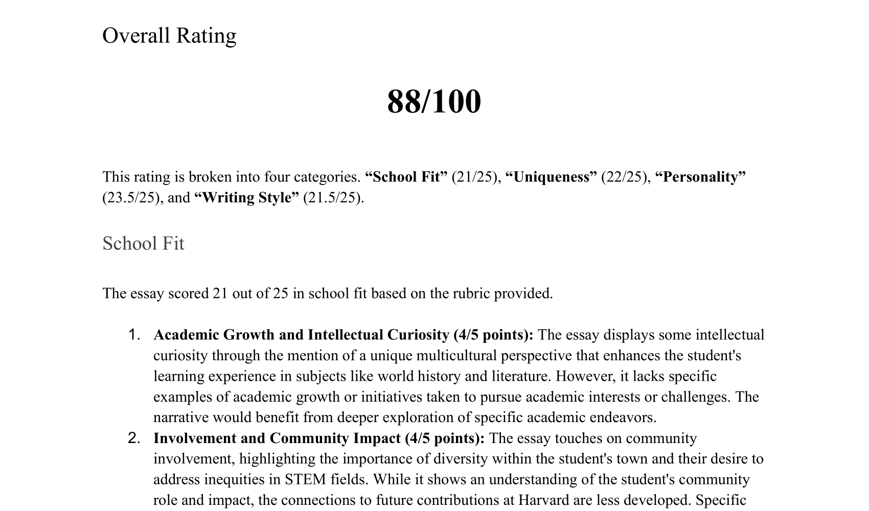 We assess your essay based on a personalized rubric to get an objective picture of where it stands compared to admitted essays.