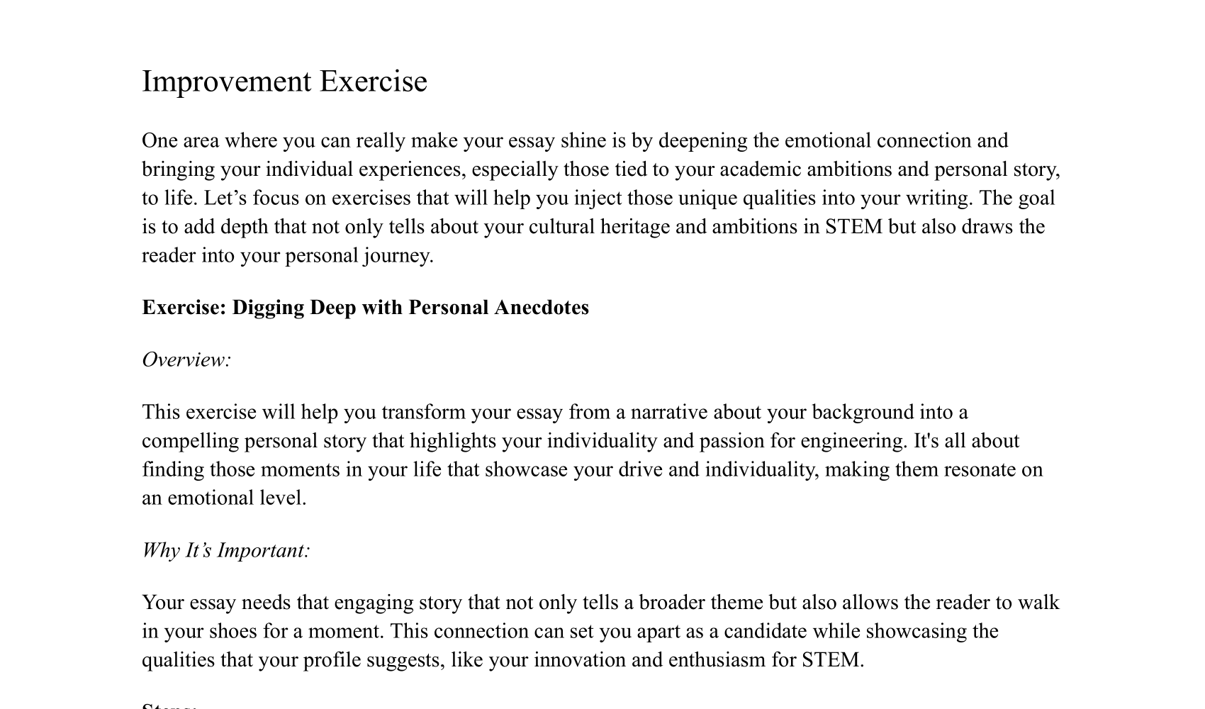 We assess your essay based on a personalized rubric to get an objective picture of where it stands compared to admitted essays.